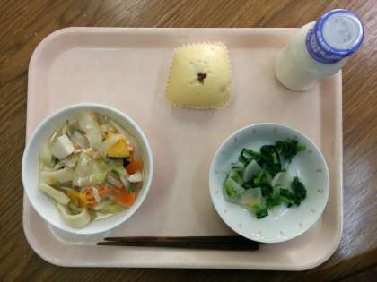 12月22日は1年のうちで一番日が短くなる冬至です。今日の給食は冬至にちなんで、「ホウトウ」「カブのゆずかけ」「甘納豆入り蒸しパン」「牛乳」です。