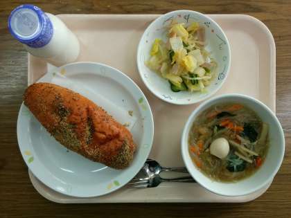 今日は、5年生のリクエスト給食です。メニューは「揚げパン」「肉団子入り春雨スープ」「白菜の中華サラダ」です。白菜は冬が旬の野菜です。