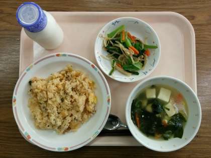 今日の給食は、「キムタクごはん」「ナムル」「わかめスープ」「牛乳」です。