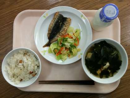 今日は節分です。今日のメニューは節分にちなんで、「豆ごはん」「魚のかば焼き」「即席づけ」「すまし汁」「牛乳」です。