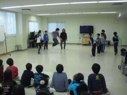 はじめは長なわを跳んでいる様子を表現します。子どもたちは、長なわが回っている中を楽しく跳んでいるように見せていました。見ている子どもたちからは、「すごい!」「本当になわが回っているみたい」と歓声が湧いていました。
