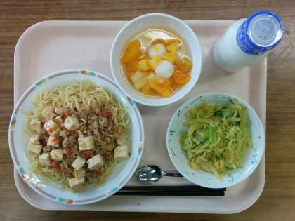 今日の給食は6年生のリクエスト給食です。メニューは、「マーボー豆腐焼きそば」「野菜の中華風味」「フルーツ白玉」「牛乳」です。