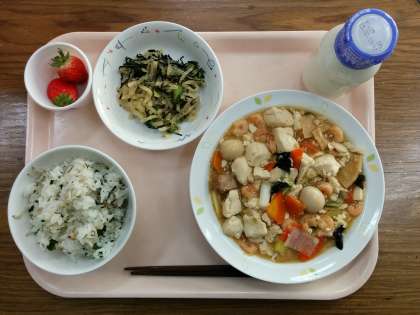 今日の給食は、「わかめとジャコのごはん」「豆腐の五目炒め」「大根サラダ」「いちご」「牛乳」です。