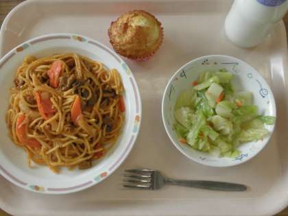 明日2月14日はバレンタインデーです。バレンタインデーにちなんで今日の給食は「スパゲティナポリタン」「キャベツサラダ」「ジャムマフィン」「牛乳」です。ジャムマフィンはイチゴジャムを混ぜて作りました。