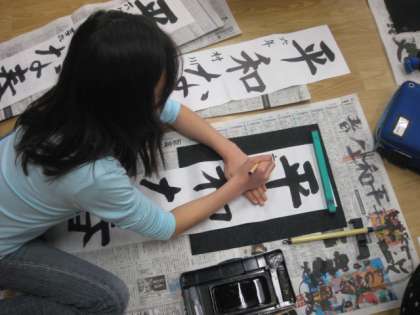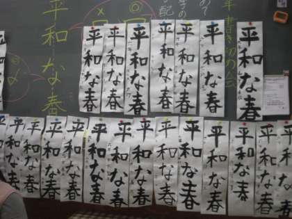 6年生の書き初めは、「平和の春」と書きます。字のバランスを考えて書いていました。うまく書けたでしょうか。