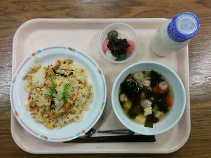 今日はひなまつりです。今日の給食はひなまつりにちなんで、「ちらしずし」「てまりふのすまし汁」「三色だんご」「牛乳」です。