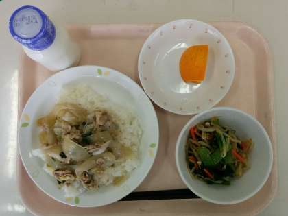 今日の給食は、「ねぎ豚塩丼」「ナムル」「デコポン」「牛乳」です。
