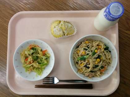 今日の給食は、「しょうゆラーメン」「中華サラダ」「かぼちゃのケーキ」「牛乳」です。