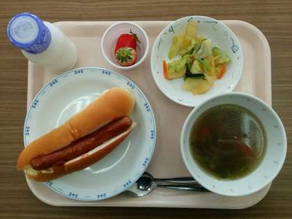 今日の給食は、「セルフウインナーサンド」「レタススープ」「ジャガイモサラダ」「いちご」「牛乳」です。いちごは、「とちおとめ」と「あまおう」の2種類を用意しました。