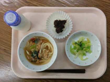 今日の給食は春のお彼岸にちなんで、「きつねうどん」「キャベツの塩コンブかけ」「ぼたもち」「牛乳」です。