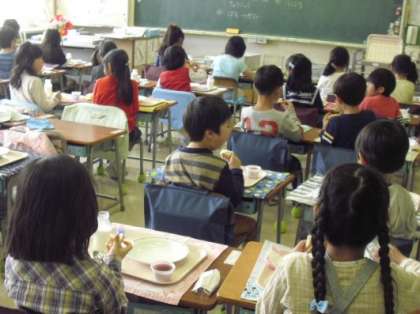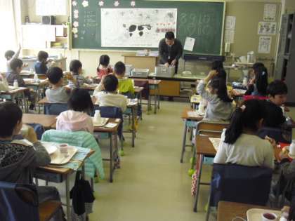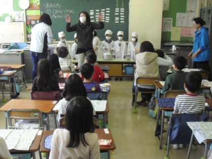 1年生は今日から給食が始まりました。担任の先生に配ぜんの仕方を習い、静かに準備しました。初めての給食のメニューは、「カニパン」「ぶどうゼリー」「牛乳」です。