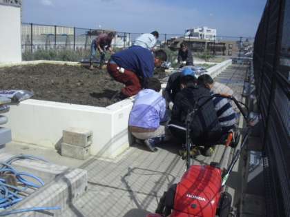 屋上田んぼでは、上祖師谷郷土研究会、学校運営委員会、そして地域の方々のご協力により、田おこしの作業が行われました。今後5年生が行う米作り体験のための準備です。