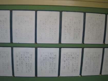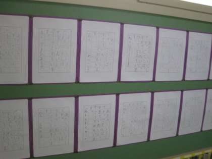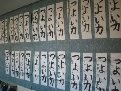 今日から「書き初め展」です。書き初めで書いた作品が、廊下に掲示されています。どうぞ見に来てください。子供たちが心をこめて書きました。1年生から3年生までの作品です。