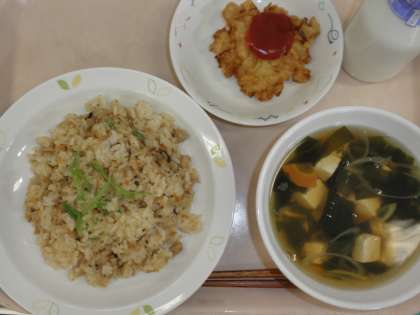 今日の給食は「そぼろごはん」「大豆とコーンのフリッター」「すまし汁」「牛乳」です。フリッターに入っている大豆は「畑の肉」と言われるほど栄養が豊富で、体や血をつくる働きがあります。成長期の皆さんには必要な栄養なので、苦手な人もいると思いますが、挑戦してみてください。