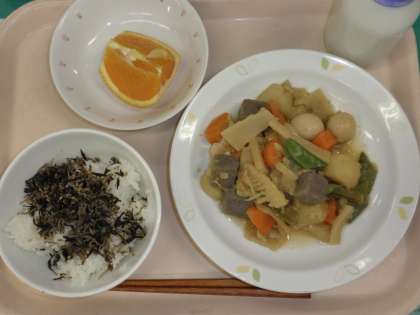 今日の給食は「ごはん」「じゃことひじきのふりかけ」「春野菜のうま煮」「清見オレンジ」「牛乳」です。今日の給食についてのクイズです。春野菜のうま煮には春が旬の食材が何種類入っているでしょう?