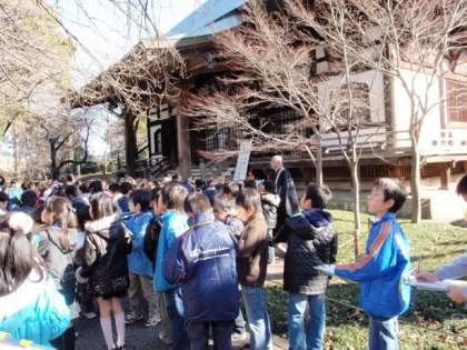 九品仏についたころはまだ朝の寒さが残っていました。ピンとした空気の中での見学でした。キャロットタワーからのながめは抜群で、塚戸小学校のあたりをみんなで確かめました。次太夫堀公園では、古い民家の建物や道具の見学でした。