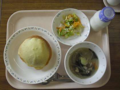 今日の給食はビスキュイパン、ベーコンと野菜のスープ、フレンチサラダ、牛乳です。