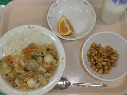 今日の給食は中華丼、大豆とジャコの甘辛揚げ、清見オレンジ、牛乳です。