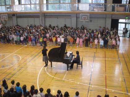 今日の朝は音楽集会でした。「君をのせて」を全校で歌いました。体育館いっぱいにこだます声を聞いていると、気持ちよくなりました。全校の子供が一つになります。