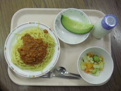今日の給食はスパゲティミートソース、フレンチサラダ、メロン、牛乳です。