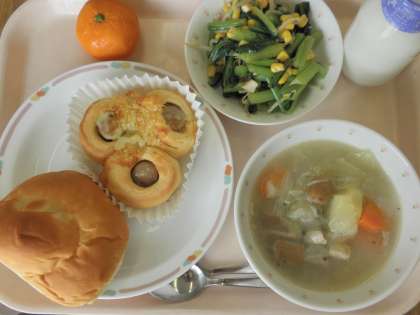 今日の給食は、ポトフ、青菜のサラダ、冷凍ミカン、1・2・5・6年生はパインパン、3・4年生は手作りのウィンナーパンです。野菜がたっぷり入ったポトフのレシピを学校のホームページにのせるので、お子さんと一緒にぜひ作ってみてください。