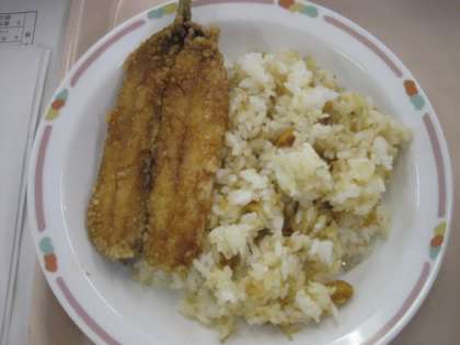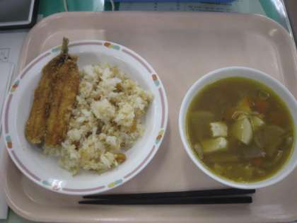 今日の給食は、節分にちなんだ給食です。豆ごはん、イワシのかば焼き、かみなり汁です。豆は、鬼を追い払います。イワシはヒイラギにさして玄関に置きます。かみなり汁は鬼を連想します。子供たちは、意味を知って給食を食べました。