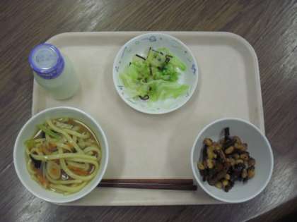 今日の給食はきつねうどん、キャベツの塩こんぶかけ、お豆かりんとう、牛乳です。
