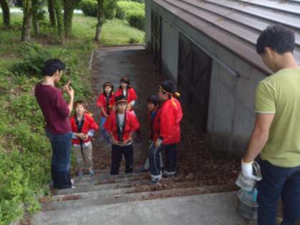 キャンプファイヤーで松明を持つ子どもたちが待機しています。