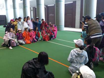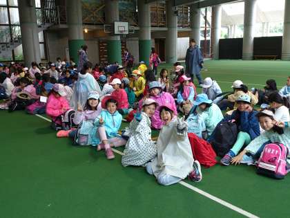 カッパを着て集合。閉室式までのひとときです。