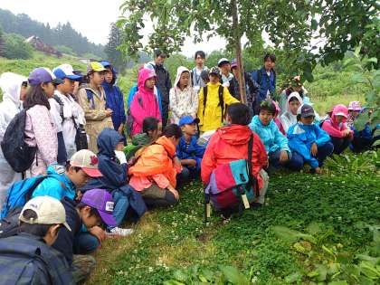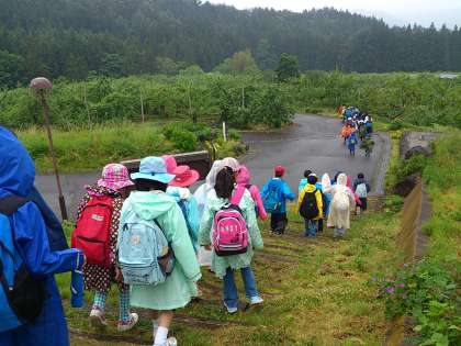 小雨の中、村めぐりに出発しました。林業体験も、予定を少し変更しながら、スタートしました。