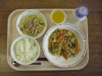 今日の給食はごはん、回鍋肉、春雨サラダ、フルーツゼリー、牛乳です。