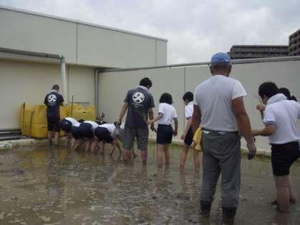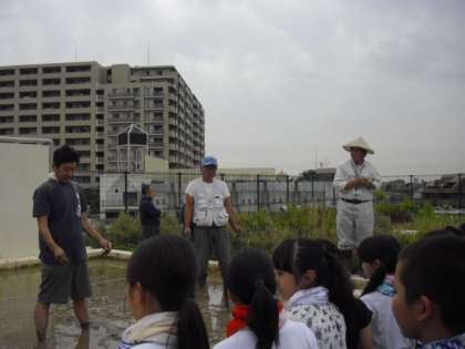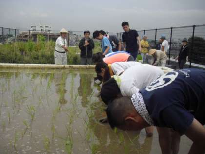 今日は5年生が屋上田んぼで田植えを行いました。例年同様、学校運営委員会、上祖師谷郷土研究会、おやじの会OBの皆様にご協力いただきました。
