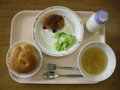今日の給食はセサミパン、コロッケ、ひとしお野菜、ジュリエンヌスープです。今日から読書週間が始まります。そこで、今日のコロッケは「こまったさんのコロッケ」という本に出てくるツナカレー味のコロッケにしました。ごはんやお菓子が出てくる絵本や物語もたくさんあります。お気に入りの一冊を図書館で探してみてください。