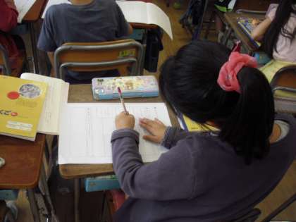 「案内状の書き方を知り、丁寧に書くことができる」「言葉で書くことで、伝えたいことを表すことができる」ことが本時のねらいです。おうちの人たちに送る「なかよしフェスタ」リハーサルの案内状に必要な事柄を熱心に考えていました。