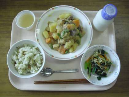今日の給食は、大豆とじゃこのごはん、肉じゃがうま煮、野菜のからししょうゆかけ、梅ゼリーです。先日、梅雨入りが発表されました。今日は入梅で、暦の上でも梅雨になりました。そこで、ジメジメした季節にさっぱりと食べられるように、梅を使ってゼリーをつくりました。ぜひ、味わってください。