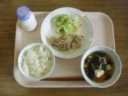 今日の給食は、ごはん、豚のしょうが焼き、野菜の甘酢かけ、冬瓜のすまし汁です。冬瓜は、「冬の瓜」と書きますが、実は夏が旬の食べ物です。冬瓜には体の熱をとったり、余分な水分を体の外に出したりする働きがあります。暑い日が続き、冷たい飲み物を飲む機会が増える季節です。夏野菜を上手に食べて、体を冷やしすぎないようにしましょう。