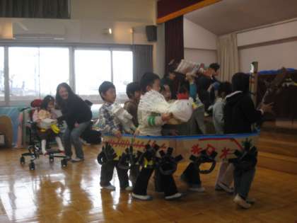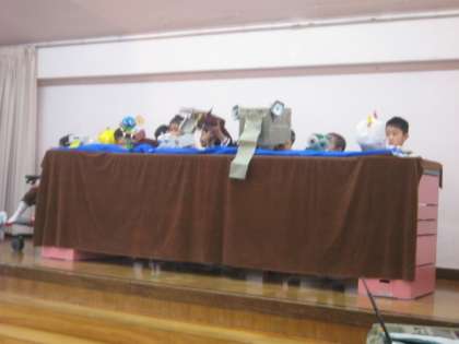 人形劇「いけ!いけ!わんぱくだん」でした。9人の仲良しわんぱく団が、仲良く一生懸命取り組んでいる姿を見せてくれました。