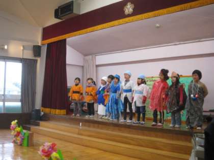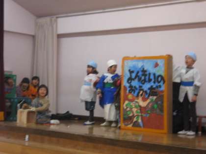 飛び出す絵本「4まいのおふだ」でした。絵本の大きさにびっくりでした。大きな絵本から飛び出した子どもたち。4枚のおふだの話を楽しく演じました。