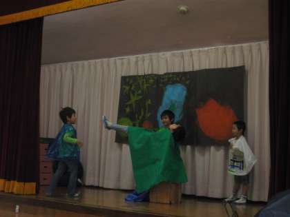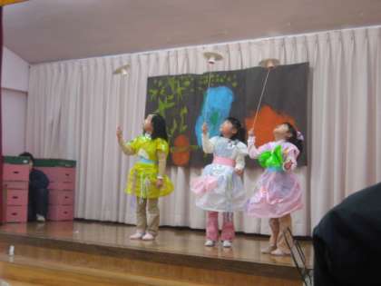劇「宇宙へGO!」でした。宇宙へ行って、探検隊はお笑いショーをしたり、音楽隊はハンドベルや皿回しのショーをしたりしました。お笑いありの楽しい劇になりました。