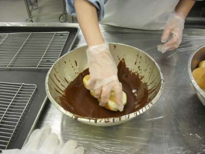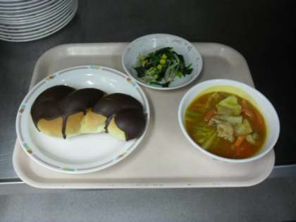 明日は、バレンタインデーなので、チョコレートにちなんだ給食でした。パンにチョコレートをかけて焼きました。
