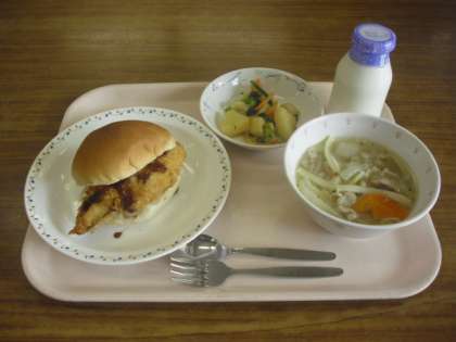 今日の給食は、セルフィッシュサンド、じゃがいもサラダ、ヌードルスープです。ヌードルスープにはヌイユというフランスで生まれためんを入れました。今週のレシピにのせてありますので、お子さんと一緒に作ってみてください。