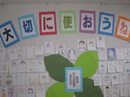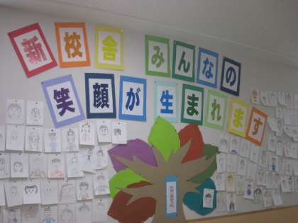新校舎の1階に、新校舎を祝って一人ひとりの笑顔が掲示してありますので、ご覧ください。4年生以上の子供たちが書いたものです。図工の教諭のアイデアです。