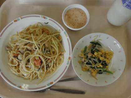 今日の給食は、ツナサラダスパゲッティ、小松菜サラダ、パンナコッタです。今日はカルシウム強化メニューです。暑くなり、汗をかく機会が増えてくるとカルシウムも一緒に体の外に流れていってしまいます。成長期の皆さんにはとても大切な栄養素ですので、しっかり摂るようにしましょう。
