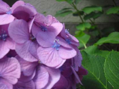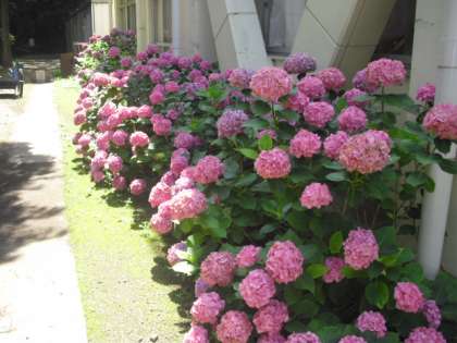 バス停から学校へ、テラスの道沿いの青いアジサイと学校内のピンクのアジサイのコントラスがとてもきれいです。ご存知かもしれませんが、花弁のように色鮮やかなものは、「がく」と呼ばれるもので、一つのアジサイの花は、その花弁のように見えるがくの真ん中についているとても小さい花です。ぱっと見の華やかさとは異なり、とてもかわいい花です。少し足を止め、ぜひ、顔を近づけてみてください。
