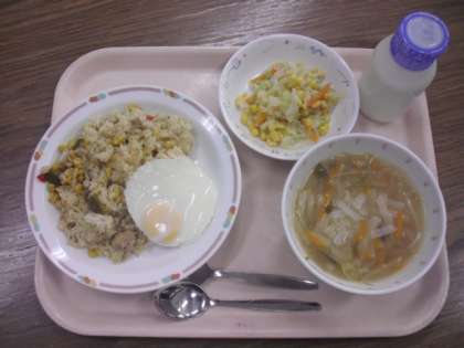 今日の給食はナシゴレン、コーンサラダ、フォーです。暑くなると食欲が落ちてきます。今日は暑くても食が進むように、一年を通して暑い気候のアジアの国で食べられているメニューにしました。目玉焼きはごはんの上に自分でのせて食べてください。