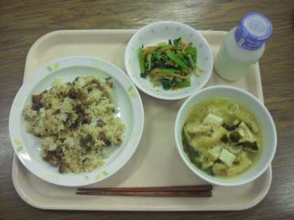 今日の給食は、さんまごはん、野菜のごまだれかけ、みそ汁です。さんまには貧血を予防する働きがあります。汗をかくと、血のもとになる成分が汗と一緒に体の外に出てしまうので、しっかりと食べましょう。さんまには小骨があるので、のどに刺さらないように気をつけてください。