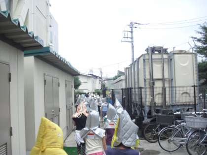今月の避難訓練は、塚戸幼稚園からの出火したという想定のもと、校庭には避難できないので千歳中学校まで避難する訓練を行いました。
