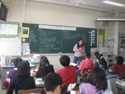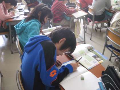社会科の授業です。暖かい沖縄と寒い北海道の宗谷地方を比べながら、それぞれの気候を生かした農業を調べます。気候条件を生かして農業をしている人々の工夫を調べていました。よく考えている子どもたちです。