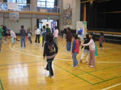 3学期になると、「あそぼうデー」の遊びはとても上手になります。異学年同士がしっかり仲良しになっています。体育館では、1年生と6年生が遊びに興じていました。