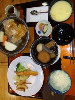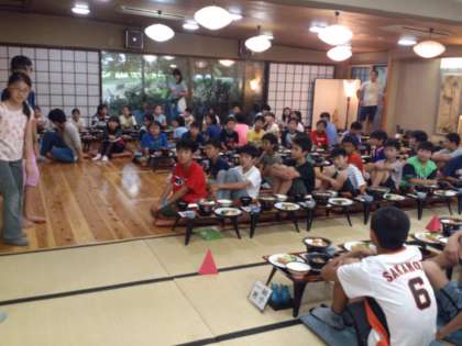 ホテルなので夕食も豪華です。人数が多いための2ヶ所の食堂で食べます。ここは大広間です。